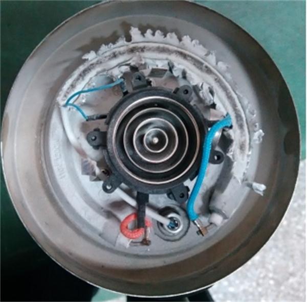 以下图片是110V1200W电水壶用在220V电压上的试验结果,从发热管剖开图片上看镁粉整圈发黑,发热丝断阻。
