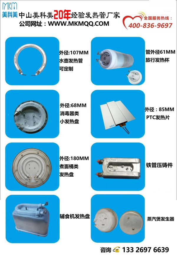 可以登录中山市美科美的公司网站,上面会有我们公司的各种用途和尺寸的发热管和发热盘以及公司企业动态。WWW.MKMQQ.COM