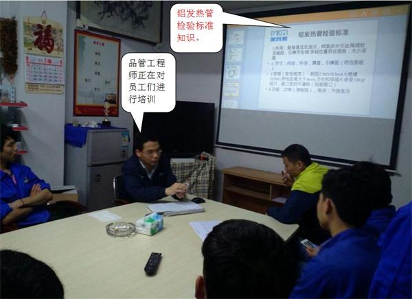看下图,品管工程正在对铝发热管厂员工们进行铝发热管检验标准培训呢。