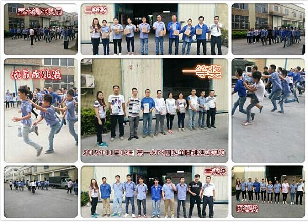 五个部门,五个小组,每组8个人一起单腿跳,比的就是团队合作达成目标,最后是美科美电热管厂的办公室队获得第一名,第一名到第四名都有奖励,最后一名被处罚做俯卧撑;