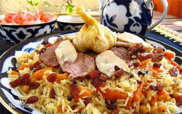 抓饭是新疆维吾尔族菜品,主要的原料是用新鲜羊肉,胡萝卜、洋葱、清油、羊油和大米。做法是先将羊肉剁成小块用清油炸,然后再放洋葱和胡萝卜在锅里炒,并酌情放些盐加水,等二十分钟后,再把洗泡好的大米放入锅内,不要搅动,四十分钟后,抓饭即熟,适时彻底将锅内的所有食材翻动搅拌,佐以凉拌菜即可食用。做熟的抓饭油亮生辉。味香可口。维吾尔族把抓饭视为上等美餐。