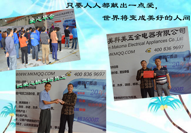 中山美科美五金电器有限公司自成立以来,公司内部就开始有一个爱心奖金会,就是预防做出能帮助需帮助的人,所以这次公司除了动用爱心以外,我们全体人员也给了这位生病的员工给予募捐。