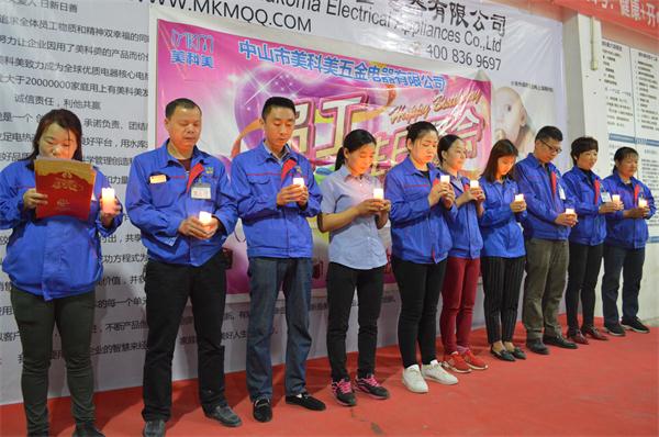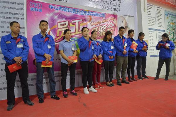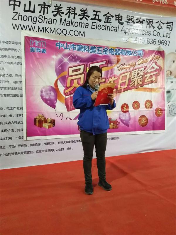 中山美科美发热盘厂的陈总上台给寿星们送上祝福致词,远离家乡的他们来到美科美工作不容易,甚至有些员工在美科美从开厂就工作到现在,时间和青春都奉献着公司,你们的付出,相信公司也会给予着大家有种家的感觉。