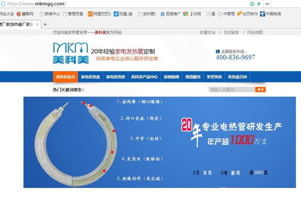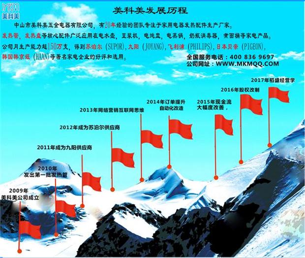 美科美公司,是有20年经验的团队专注于家用电器发热配件生产制造的厂家。发热管,发热盘等核心配件广泛应用在电水壶、开水桶、煮面桶、豆浆机、电炖盅、电蒸锅、奶瓶消毒器、蒸汽煲、婴儿辅食机等家电产品。 目前公司月生产能力超150万支,特别是电水壶发热管与国际温控器Strix,Otter公司有良好的配合,得到苏泊尔(SUPOR),九阳(JOYANG),法国赛博(SEB),日本贝亲(PIGEON),韩国韩京姬(HAAN)等著名家电企业的好评和选用。