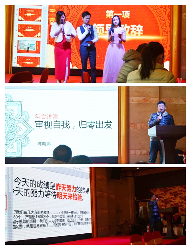 开始由我们美科美发热管厂的陈总进行对年终业绩和幸福的分享: